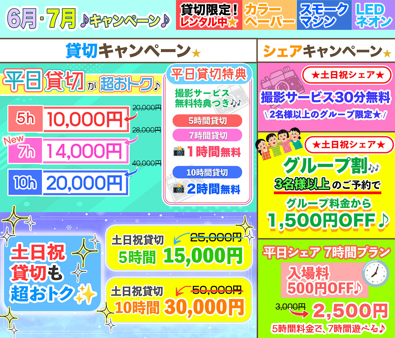 ▶︎6月・7月は平日貸切&休日貸切キャンペーン開催中🎉🌟