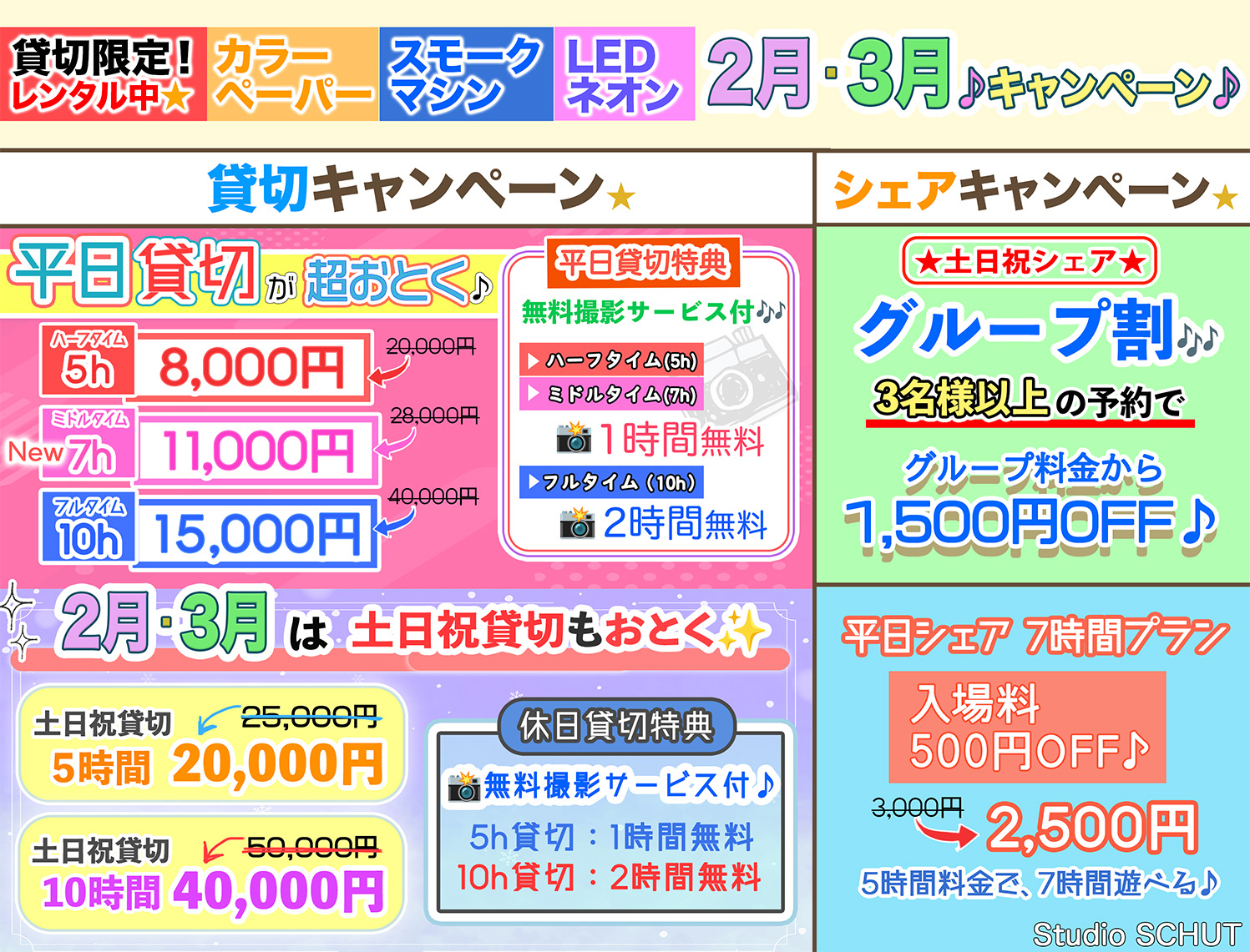 ※スタッフのシフトの関係上、シェア利用時の2時間を超える撮影サービスは当日の状況により対応できない場合がございますので、あらかじめご了承ください。
