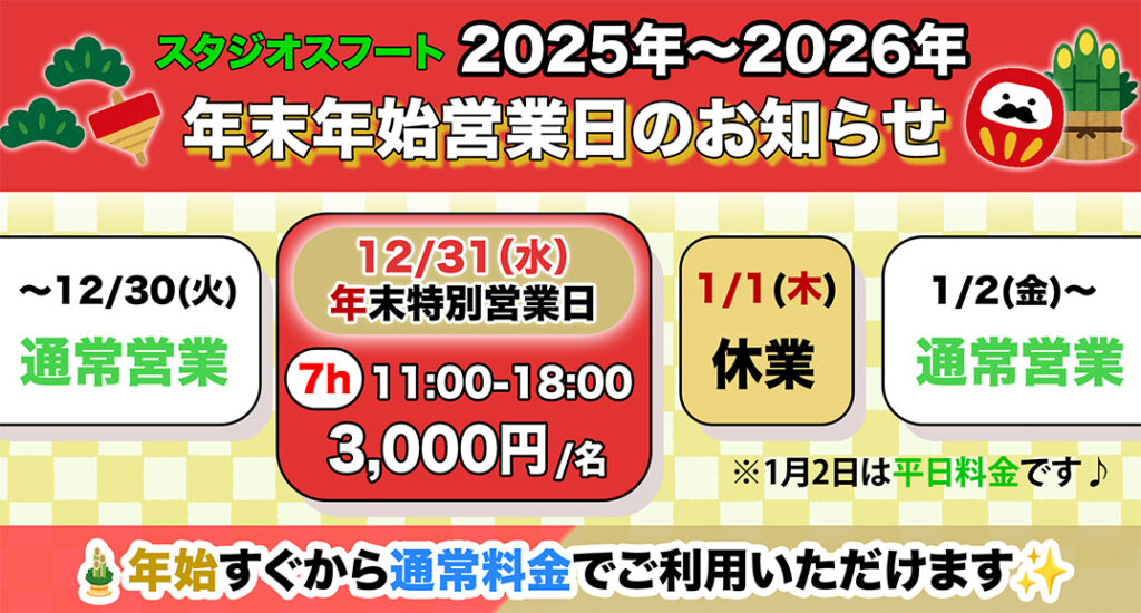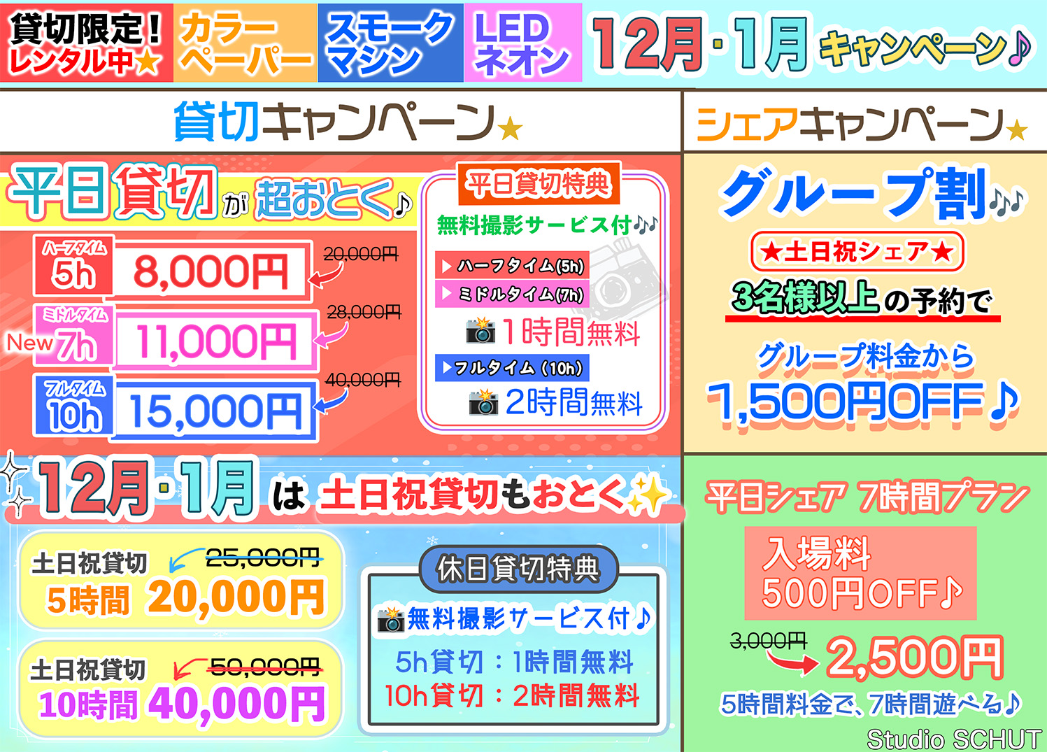 ※スタッフのシフトの関係上、シェア利用時の2時間を超える撮影サービスは当日の状況により対応できない場合がございますので、あらかじめご了承ください。